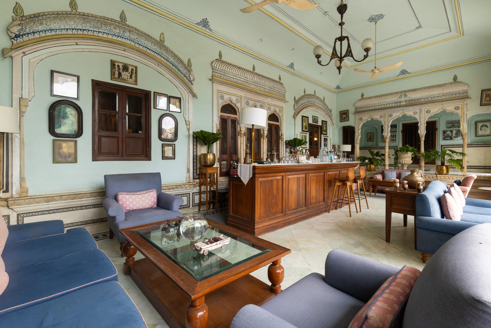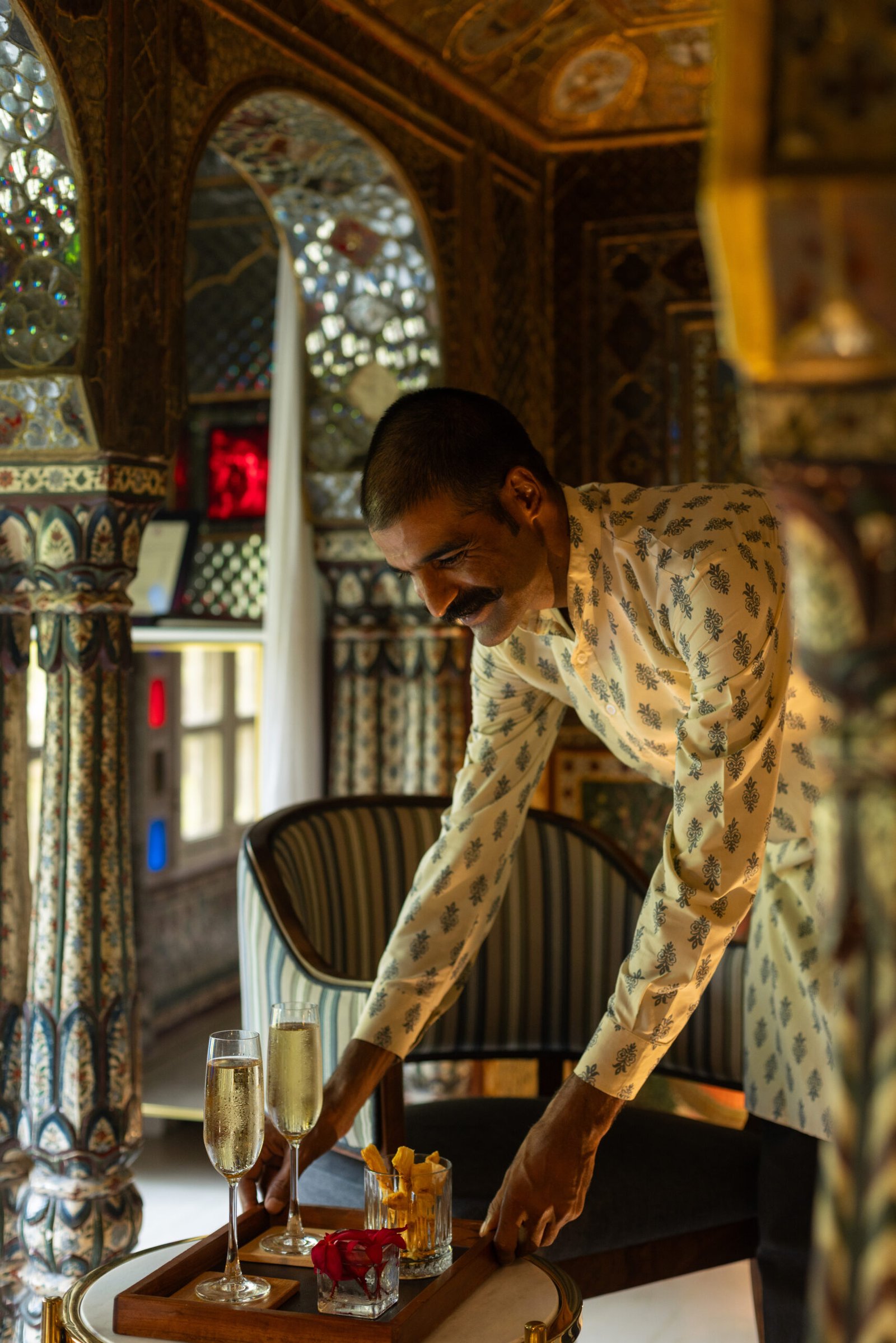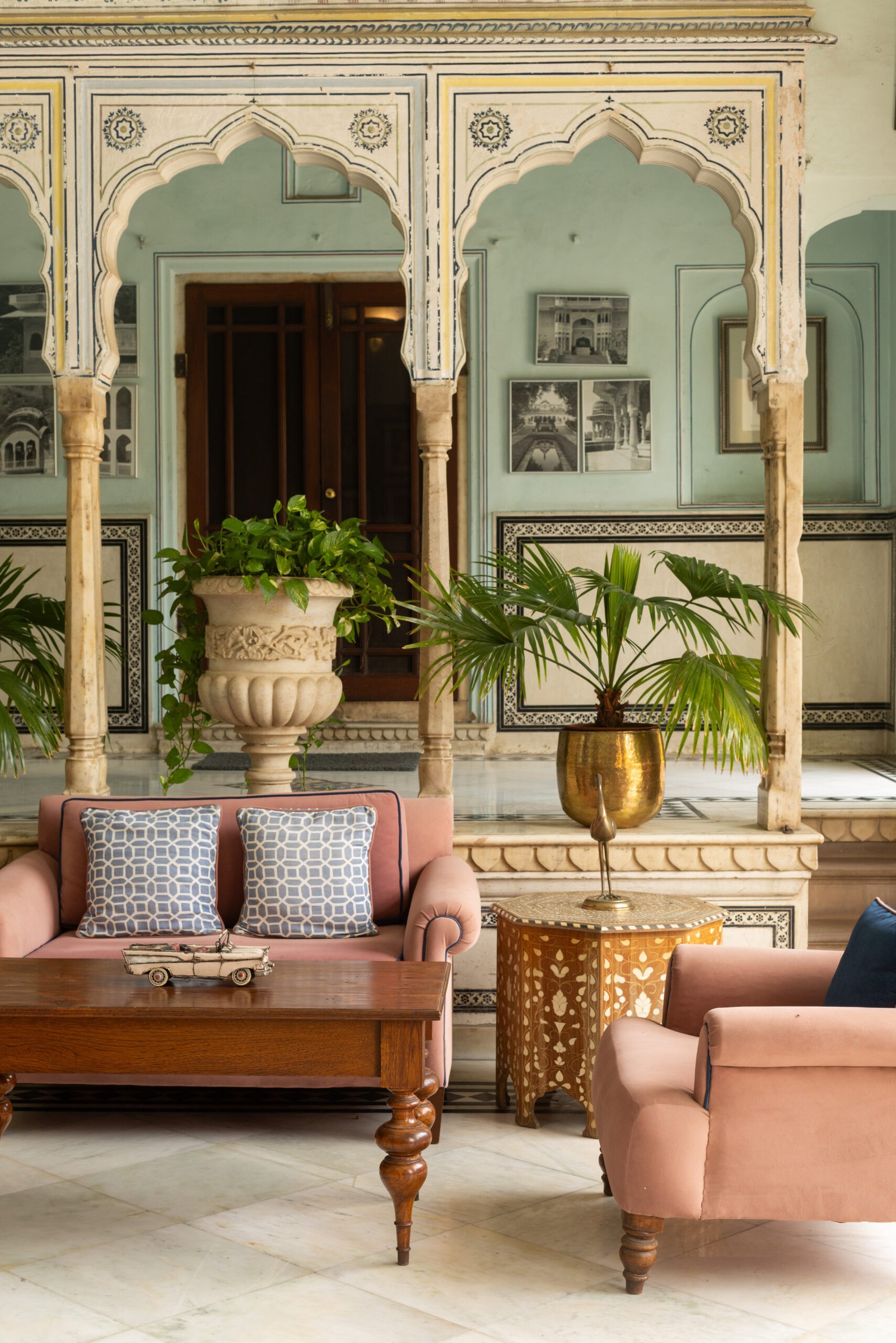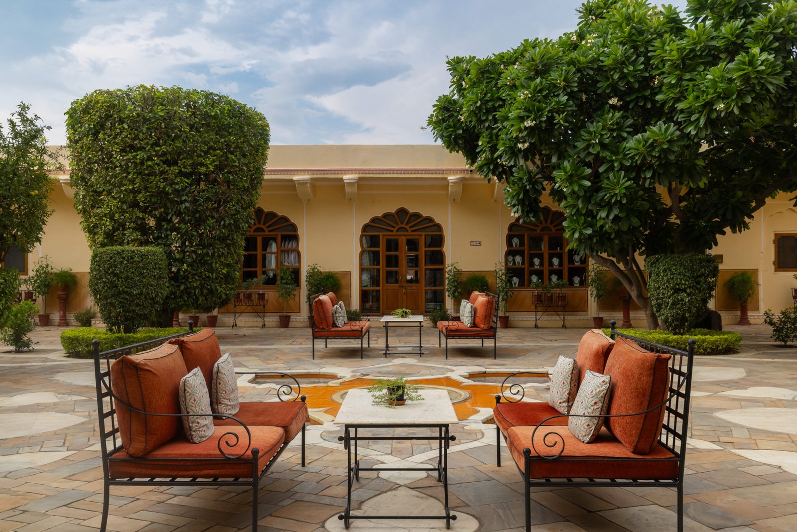 The grand lounge, alive with frescos and classic furniture, is a dreamy spot to relax after a day of sightseeing. Wide verandahs and hidden terraces offer space to sip chai or enjoy a sundowner with views over old Jaipur, while the central courtyard is always alive with birds and fragrance. The Moorish-style swimming pool is set among gardens, flanked by daybeds and canopied lounges for a blissful break from the city heat.