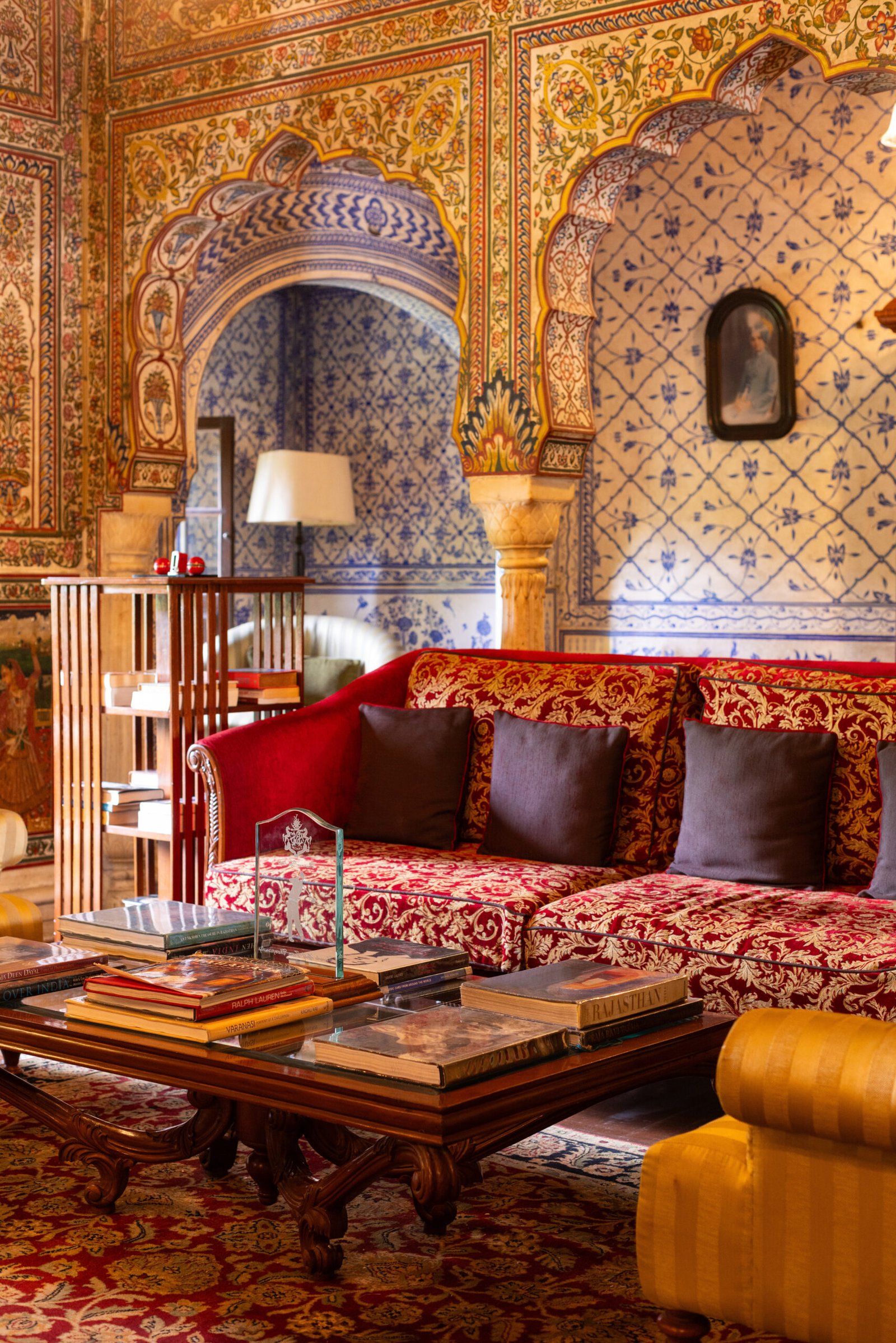 The courtyard is definitely one of the most iconic parts of the property. From there, you’re guided to the check-in area and that room is a highlight on its own. Every inch of it is painted, and right in the middle is this mural of Samode Palace that looks like a drone shot. But of course, it’s not, someone must’ve climbed a nearby mountain back in the day to sketch that view. That kind of imagination, and the effort behind it, is impressive.